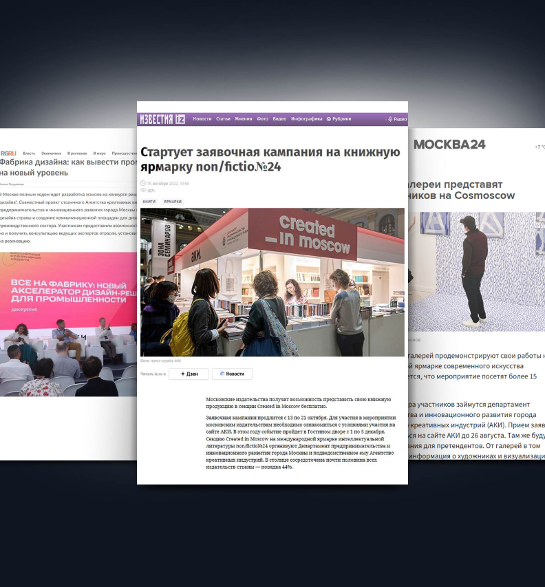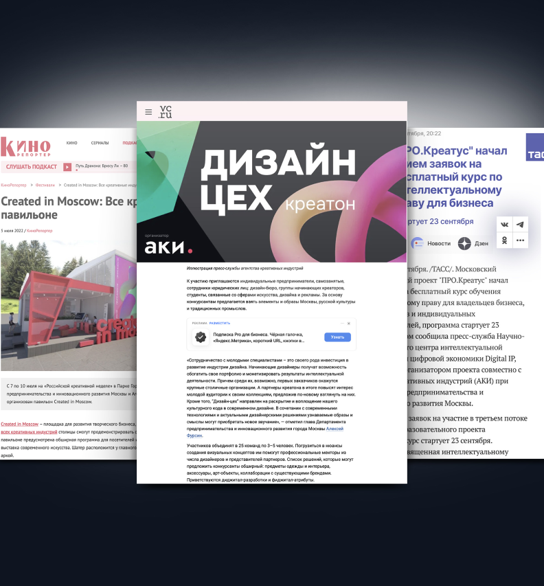 Одно из основных направлений работы – популяризация деятельности креативных предпринимателей и мер государственной поддержки. Для реализации этой информационной кампании АКИ выбрало Агентство Prophet, имеющее многолетний успешный опыт работы в публичном продвижении сферы российского креативного предпринимательства в РФ и за рубежом.
